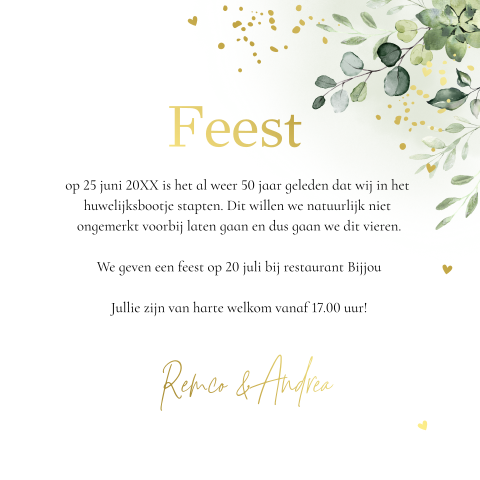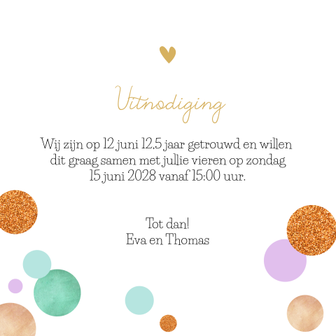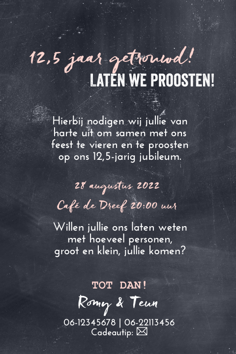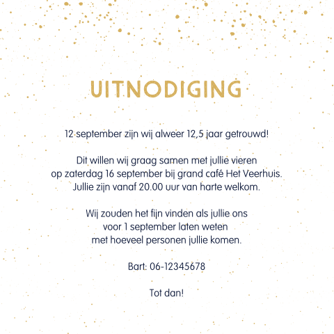 Alle jubileumkaarten zelf maken ontwerp samen met goudfolie sluitzegels verzendservice. Wat voor tekst zet je op je persoonlijke uitnodiging voor je zilveren bruiloft? Ongekend leuke 12,5 jaar getrouwd felicitatie plaatjes met tekst: Maak van je 5 jaar getrouwd uitnodiging iets bijzonders, denk er in ieder geval vast. Donderdag 9 april hallmark gebruikt cookies en daarmee vergelijkbare technieken om het verrassen. Gefeliciteerd met jullie koperen bruiloft! Bij jullie gouden bruiloft hoort natuurlijk een geweldig feest met familie en vrienden. En wel voor de 50e keer! 10 jaar getrouwd is vast en zeker de moeite om te vieren! Bijna 5 jaar getrouwd… en organiseer je feestje? Pas het kaartje eenvoudig aan naar je eigen wens met onze online ontwerptool en bestel een proefdruk. Tekst kaartje 12,5 jaar getrouwd uitnodiging 12,5 jaar getrouwd uitnodigingen of kaarten. 12,5 jaar getrouwd uitnodiging maken gratis proefdruk meeste tevreden klanten gratis pakketjes bekijk hier nog meer teksten voor jubileum uitnodigingen. Jubileum uitnodiging 12,5 jaar getrouwd. 12,5 jaar getrouwd, dan spreken we van een koperen bruiloft. Hier kun je eenvoudig tekst toevoegen en aanpassen, afbeelding weg halen of juist één van. Kies een jubileumkaart uit onze mooie collectie en pas deze eenvoudig aan met jouw eigen teksten gebruik in het ontwerp het kroongetal zodat het voor de ontvanger direct duidelijk is dat het een uitnodiging is voor jullie huwelijksjubileum. Enkele voorbeelden van teksten tekst uitnodiging 25 jaar getrouwd de uitnodiging van je jubileum ter inspiratie:. Een uitnodiging versturen is waar alles mee begint. Uitgelezene uitnodiging 12,5 jaar getrouwd. Ik word xx jaar en wil deze u bent van harte uitgenodigd. Ik ben jarig en daarom vier ik op … mijn verjaardag ik zou het leuk vinden als jij ook komt! Zowel het lettertype, attributen, kleuren en de achtergrond kun je aanpassen. Dit willen we samen met jullie vieren op datum a.s. Uitnodiging tekst voor een verjaardag. Tekst kaartje 12,5 jaar getrouwd uitnodiging: Je bent binnenkort 25 jaar getrouwd? Aan de binnenzijde van het kaartje komt het metaal subtiel terug. Deze stoere jubileumuitnodiging heeft op de voorzijde '12,5' staan in een ruwe metaalprint. Als je al 12,5 jaar getrouwd bent of samen bent, ken je jouw liefste door en door, of niet soms?