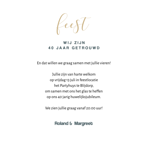 Komt u dit met ons vieren? Dat is een grootse mijlpaal, waarvan niet veel mensen kunnen zeggen dat ze dat bereikt hebben. Een zilveren bruiloft wil je natuurlijk wel vieren met familie en vrienden.