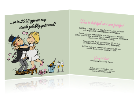 Stuur deze vrolijke jubileumkaart met cartoon van bruidspaar naar je gasten en nodig ze uit om samen dit kaartje is toegevoegd aan je eigen collectie. Een 25 jarig huwelijk wordt ook wel een zilveren huwelijk genoemd.