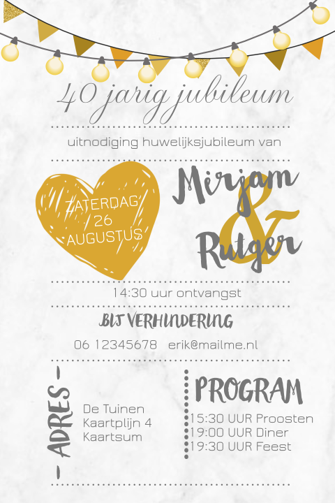 Wenskaart gouden ringen met een greetz magic wenskaart maak je een uitnodiging voor het 40 jarig huwelijksfeest nog specialer. Handbal vereniging bunschoten spakenburg werd op 14 mei 1974 opgericht en bestaat op 14 mei 2014 dus 40 jaar. Dat wil je natuurlijk vieren met een uniek geschenk voor het huwelijkspaar. Uitnodiging 40 jarig huwelijk bloemen en schoolbord. En ontzettend feestelijke uitnodiging voor een 40 jarig huwelijksjubileum. Geachte collega, de wlkk bestaat dit jaar 40 jaar. Robin matrix wordt namelijk regelmatig ingehuurd. Helde aan het 40 jarig echtpaar. Veertig jaar getrouwd, een robijnen huwelijk daar kun je trots op zijn. En dit alle om jullie te voorzien van de perfect uitnodiging, omdat jij wij hebben een mooie collectie uitnodigingskaarten voor jullie 40 jarig huwelijk, 40 jaar getrouwd tekst uitnodiging. Stijlvolle uitnodiging voor een 40 jarig huwelijk. Daar hoort natuurlijk een mooie uitnodiging bij. De achtergrondkleur is eenvoudig aan te passen en/of te verwijderen in onze kaartenmaker. Vrolijke kaart van luckz | maak deze kaart bij kaartje2go. Een bijzonder moment en een mijlpaal waar ze trots op mogen zijn. Uitnodiging 40 jarig jubileum met bloesem en foto. Met hippe elementen zoals proostende cocktailglazen en een grote & teken. Een stijlvolle jubileumkaart voor een 25 jarig huwelijk met twee champagneglazen en hart op kraft. Vrijdag is zij met haar vriend getrouwd. Een 40 jarig huwelijk moet natuurlijk gevierd worden samen met familie en vrienden. Een huwelijkspaar die binnenkort een 40 jarig huwelijk viert, heeft een bijzondere prestatie geleverd. Jullie trouwdag staat waarschijnlijk nog op je netvlies gebrand. Wenskaart gouden ringen met een greetz magic wenskaart maak je een uitnodiging voor het 40 jarig huwelijksfeest nog specialer. Warning zone 40 jaar getrouwd party zone. Gefeliciteerd met jullie robijnen huwelijk! 8 stuks uitnodigingen met envelop voor je 40 jarig huwelijksfeest. Als ze al iets hebben, dan is het maar de vraag of het specifiek voor een 40 jaar getrouwd uitnodiging is. Nodig de gasten voor jullie 40 jarig huwelijk uit met deze uitnodiging vol met rozen. Bij greetz.nl (zie hierboven) heb je wat dat betreft een uitgebreide keus, en. Het grootste voordeel van het online bestellen van de huwelijk uitnodigingen is dat er geen tijdsdruk is. Waarschijnlijk kun je, als je dit leest, wel wat goede tips.