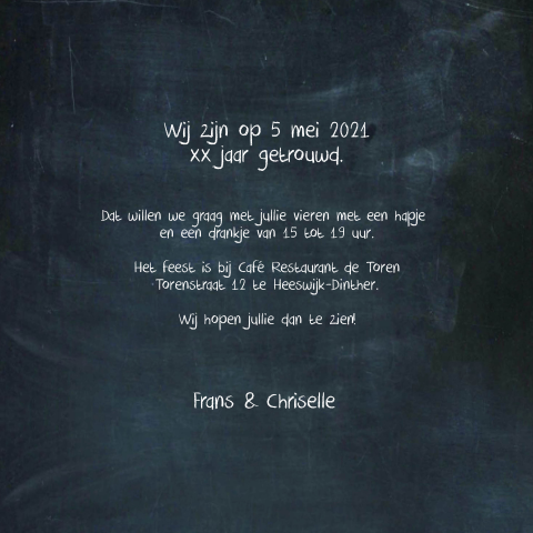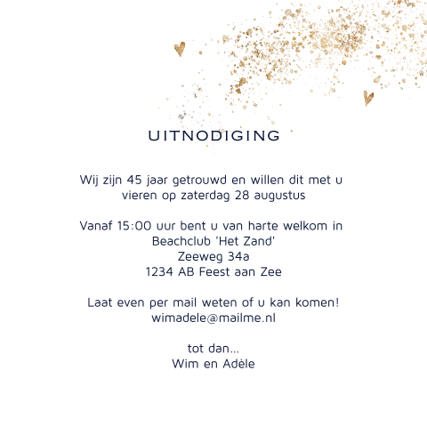 Omdat we nog steeds heel gelukkig zijn met elkaar willen we dit graag met jullie vieren op dag datum. Nadat je een leuke 50 jaar getrouwd kaart hebt gevonden uit onze collectie is het tijd om de uitnodiging te maken. Uitnodiging 12.5 jaar getrouwd in rap vorm. Waarom ze dat aan mij vragen, geen idee, want ik kan er zelf niets van. Voor hulp en vragen neem gerust contact met ons op! Omdat we nog steeds heel gelukkig zijn met elkaar willen we dit graag met jullie vieren op dag datum. 60 jaar getrouwd (niet ik e ). De veertig wordt ondersteund door veel sterren confetti. Zo kun je kiezen uit vijf luxe papiersoorten : De uitnodiging 50 jaar getrouwd maak je heel eenvoudig online in onze kaartmaker. Geen, stoer, hartje, jubileum, uitnodiging, hip, foliedruk, chic, staand, 25, rechthoekig staand, enkel, groen, lovz vanaf € 1,45 p/st. Bloemen, huwelijksjubileum, met foto, overige jaren getrouwd, bloemen, dubbel, vierkant. Vriendelijk geprijsd de uitnodigingen van kaartkeuze zijn bijzonder vriendelijk geprijsd en hebben ook nog eens geen verzendkosten! Uitnodiging teksten voor elke gelegenheid. Het ontvangen van een uitnodigingskaart. Goed dat ik niet mee moet ik ben benieuwd. Je zit precies tussen 40 jaar en 50 jaar in, maar voor nu ben je even 45 jaar. Het design is mooi doorgetrokken naar de binnenkant. • een donkerblauwe envelop past mooi bij deze jubileum uitnodiging. Uitnodigingen teksten en voorbeelden jubileum tekst uitnodiging 50 jaar getrouwd. Gaaf in champagne goud kleurige tinten. 25 jaar getrouwd zijn is zeker een feestje waard en om dit dan ook goed te vieren is een leuk feest uitnodigingskaarten 25 jaar getrouwd. Op fuif.nl bieden wij uitnodigingen aan in verschillende stijlen. Gefeliciteerd met jullie houten bruiloft! Bij jullie speciale huwelijksverjaardag hoort natuurlijk een originele uitnodiging. Bereken de prijs met onze prijscalculator. We helpen graag hoe verloopt de bezorging? Voor en met elkaar 45 jaar. Lieve ouders, 45 jaar geleden gaven. Uitnodiging huwelijksjubileum alle jubileumkaarten jubileumkaart zelf maken uitnodiging 60 jaar getrouwd uitnodiging 50 jaar getrouwd uitnodiging 45 jaar getrouwd uitnodiging 40 jaar getrouwd. Je komt meteen in de zomerse sferen.