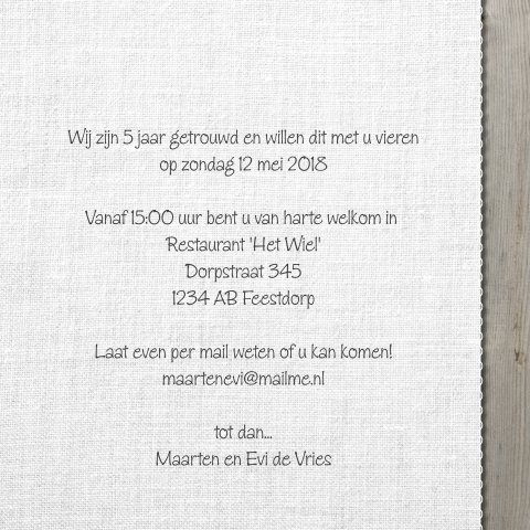 Tekst op hout 5 jaar… …samen zijn …liefde delen …elkaars gedachten …op weg naar geluk …verdriet delen …onvoorwaardelijk …plezier maken. Het houten huwelijk staat namelijk symbool voor het 5 jarig huwelijk. De tijd gaat snel, donderdag 16 juni waren we alweer 5 jaar getrouwd!