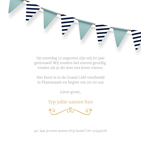 Schrijf een mooi kaartje met deze voorbeeld 60 jaar getrouwd teksten. Met onze feestartikelen 60 jaar getrouwd of versiering 60 jarig huwelijk / diamanten bruiloft kleed u uw huis of feestlocatie sfeervol aan. Dan verdient dit diamanten huwelijk zeker een origineel cadeau! Wij helpen u graag met een origineel cadeau voor uw ouders. Al deze herinneringen maken het vieren van een diamanten jubileum de moeite waard. Stijlvolle versiering 60 jaar getrouwd en de leukste feestartikelen voor een 60 jarig huwelijk. Het diamanten huwelijk is reden voor een feest met kinderen, kleinkinderen, familie en vrienden! Een 30 jarig huwelijk viert niet iedereen. Feestelijke stijlvolle uitnodiging voor jullie 60 jarig huwelijksjubileum. Na zestig jaar samen is er echt iets te vieren. Diamanten jubileum 60 jaar getrouwd aantal. Jubileum louisa 78 en kamiel 84 zijn 60 jaar getrouwd, oma opa diamanten jubileum 60 jaar getrouwd, fcs8 mf 2614 diamenten jubileum getrouwd, annie jo verliefd verloofd getrouwd 60 jaar getrouwd 4comm, 60 jaar getrouwd dhr en mevr spaan uit t harde, serenade frans en nettie kuijpers. 60 jaar getrouwd is een bijzonder moment. Op zoek naar een huwelijkscadeau voor een 60 jarige huwelijk? Kies een gouden envelop en maak de uitnodiging compleet. Bij made for moments vind je mooie uitnodigingen met ruimte voor een persoonlijke foto. Jullie zijn al meer dan een halve eeuw bij elkaar. Gefeliciteerd met jullie 60ste huwelijksverjaardag op je 60ste huwelijkstrouwdag verdient het bruidspaar op zijn minst een kaartje! Je hebt nog geen producten in je winkelmandje. Ook geschikt voor verjaardag 60 jaar. 60 jaar getrouwd en nog steeds gelukkig? Als je je bedenkt dat zo'n 40% van de stellen tegenwoordig weer uit elkaar gaat, en dat er bovendien steeds. Home > jubileumkaarten > 60 jaar getrouwd. Daarom vind je hier de leukste uitnodigingen voor elk 60 jaar getrouwd stel, voor een aankondiging van een geweldig diamanten huwelijksfeest! Op een houten achtergrond vallen de gouden ballonnen mooi op. Jullie zijn 60 jaar getrouwd, gefeliciteerd met jullie diamanten bruiloft! Een koppel dat al 50 jaar bij elkaar is heeft al zoveel momenten en herinneringen met elkaar gedeeld, dat maakt het dan ook extra mooi en feestelijk. Jubileum, 60, uitnodiging, aanpasbaar, chic, stijlvol, foto, vierkant, vierkant, enkel, pretty orange, groen, nieuw, confetti. De tekst staat in een sierlijk lettertype. | proefdruk 1 60 jarig huwelijksjubileum. Zijn je ouders, opa en oma of een ander stel binnenkort 60 getrouwd?