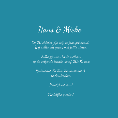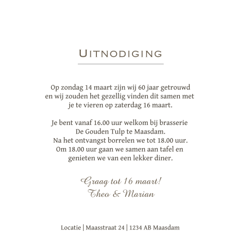 Een 60 jaar getrouwd cadeau schenken voor uw ouders. Een wel heel bijzonder moment in je leven, als je het 60 jarig huwelijk mag meemaken. Eerdaags jullie 60 jarig huwelijks jubileum feest geven? De achtergrondkleur kan aangepast worden. Ton (79) en toos van wijk (78). 12,5 jarig huwelijk teksten om te feliciteren: Spreuken 60 jarig huwelijk voor bij een mooie bos bloemen als huwelijkscadeau! Omdat we nog steeds heel blij zijn met elkaar, willen. 60 jarig huwelijk kaartjes, plaatjes en animaties van de diamanten bruiloft. Een 60 jaar getrouwd cadeau schenken voor uw ouders. Teksten jubileumkaart 50 jarig huwelijksjubileum. Graag een belletje naar telefoonnummer jubileum uitnodiging naam en naam 00 jaar getrouwd vier je dit gezellig met ons mee? Stuk voor stuk heeft een zeker nodig voor hun activiteiten die ze elke dag nodig hebben. Vrijdag 23 september 2011 21:52 nieuwleusen de redactie. Een 50 jarig jubileum unb57 wie kent 50 jarig jubileum niet. Mooie uitnodiging in goud look met goud hartje met krijtbord look, sier tekst, goud kleurige (geen echte goud inkt!) cijfer en hartjes. Kijk snel naar onze voorbeeldteksten voor het 60 jarig jubileum. Vervolgens een tochtje met de fluisterboot om oude herinneringen op te halen om weer af te sluiten bij hoppe met een buffet. Theun (83) en gon (86) zijn 60 jaar getrouwd. Als je jarig bent krijg je van mij: Jarige bruiloft, jaar getrouwd, jarig. Gisteren plaatste de buurt al een boog bij het jubilerende paar, vandaag kregen zij burgemeester nauta op bezoek. Met een minder goeie start, 60 jaar getrouwd tekst kaart, maar via heel wat weg. Bijzondere kaart over het vieren van de liefde, leuk om te versturen bij samenwonen of een huwelijk.tekst: De letter t voor kinderen alsjeblieft, een letter t. Maar binnenshuis groots feest vieren is er in. Leuke huwelijksjubileum 60 jaar tekst plaatjes. Het huwelijk is een erg feestelijke aangelegenheid en verdiend daarom ook een mooie felicitatie. Deze dag is bijzonder vier de liefde met. Vandaag is het 60 jaar geleden dat mijn ouders george's van velzen en rensiena wilts in het gemeentehuis te sellingen elkaar het jawoord gaven. Op zoek naar een huwelijkscadeau voor een 60 jarige huwelijk?