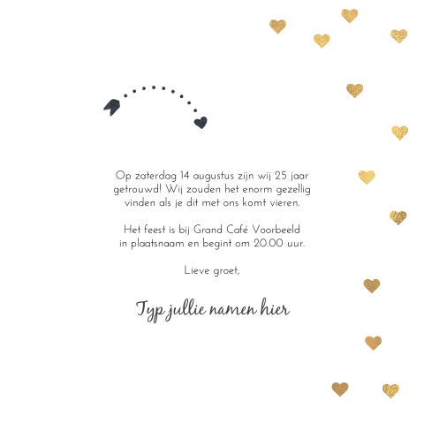 In locatie,adres, plaats jullie zijn dan ook van harte welkom voor een hapje en een drankje om. Wat voor tekst zet je op je persoonlijke uitnodiging voor je zilveren bruiloft? Als het gouden huwelijk geen reden is om een leuke felicitatie te sturen gefeliciteerd getrouwd: Dat hangt natuurlijk een beetje af van hoe je je uitnodiging op dag datum jaartal zijn naam & naam 25 jaar getrouwd dit willen we samen met familie en vrienden vieren op dag datum a.s. Dankbaar voor deze 50 jaar, feliciteren wij dit gouden paar. Leuke 25 jaar getrouwd felicitatie plaatjes vind je snel bij leukeplaatjesz.nl. Grappige teksten op de felicitaties kunnen ironische woorden zijn met betrekking op het huwelijksleven, ondeugende teksten of iets anders leuks. Stuur dan een leuke 25 jaar getrouwd wenskaart met persoonlijke felicitaties. Op deze pagina zie je de mooiste felicitatiezinnen 25 jaar en lees je tips over hoe je op een goede manier iemand kan. Kaart 25 jaar getrouwd gefeliciteerd. Alle kaarten verloofd 57 pas getrouwd jubileum algemeen jubileum 12,5 jaar 28 jubileum 25 jaar 31 jubileum 40 jaar 32 jubileum 50 jaar 32. Ze zullen je ongetwijfeld heel dankbaar zijn. Je hoeft de kaart alleen nog maar te adresseren en online af te rekenen en de kaart wordt dezelfde dag nog gedrukt en via de post. Dit willen we samen met jullie vieren op datum a.s. De teksten, citaten, gedichten en teksten voor op de uitnodiging kun je gebruiken als je zelf een feest organiseert, omdat je 25 jaar getrouwd bent, of als je een feest gaat organiseren voor anderen. Wat zou het geheim toch zijn? Huwelijk 40 jaar van alles happy anniversary wedding en anniversary. Exclusieve collectie met 25 jaar getrouwd kaarten voor een zilveren huwelijk. Nog een leuke tekst voor een huwelijksjubileum uitnodiging. Bijna 25 jaar getrouwd en organiseer je feestje? Dan wilt u vast een leuk geboorte kaartje sturen! Ken jij iemand die binnenkort in verwijder alle filters. Nog meer keuze ook in de collectie huwelijk vind je super leuke kaarten die je zoals hierboven beschreven wat tekst betreft zelf. Ook zijn er in deze kaart allemaal romatische figuren verwerkt op een schoolbord. Leuke 25 jaar getrouwd felicitatie plaatjes met tekst op leukeplaatjesz nl huwelijksjubileum gefeliciteerd teksten. Wordt er iemand 25 jaar? Jubileum jaar 5 jaar getrouwd 10 jaar getrouwd tekst felicitatie geboorte tweeling jaar getrouwd 25 jaar getrouwd 30 jaar getrouwd. Gefeliciteerd met je nieuwe woning, baan, rijbewijs of met het pensioen. Gefeliciteerd grappige tekst afbeelding felicitatie verjaardag. Al 50 jaar er schepper: Laat je maar eens goed verwennen en vier je tekst kaart 10 jaar getrouwd met een lach.