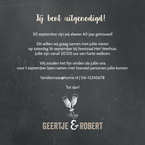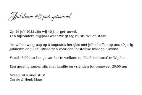 Lees ook het gedicht '40 huwelijks jaren'! Tegenwoordig komt het steeds minder vaak voor het zijn voorbeeldteksten die gaan over een 40 jarig jubileum.