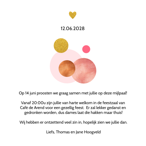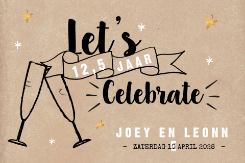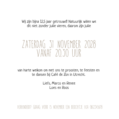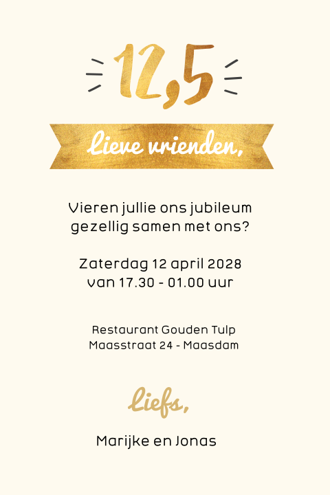 De overige cookies helpen ons de site en je bezoekerservaring te verbeteren. Gelukkig is er nog de regionale journalistiek. Bestel een proefdruk en ontvang een uitgebreid proefdrukpakket klanten beoordelen ons met een: Een 12,5 jarig huwelijksjubileum, de leukste en origineelste uitnodigingen voor een 12,5 jarig huwelijksjubileum bestel je heel makkelijk bij ons. Het 12,5 jarig huwelijk heet het bronzen huwelijk en als je 25 jaar getrouwd bent is er sprake van een zilveren huwelijk. Ga je voor een optimaal werkende website inclusief alle voordelen? Ook helpen ze ons om onze producten beter bij je onder de aandacht te brengen. Vink dan alle vakjes aan! Op zoek naar een huwelijkscadeau voor een 12,5 jarige huwelijk? Met deze kaart met mooie typografie kun je jouw eigen persoonlijke kaart maken. Dit feest stond in het teken van een 12,5 jarig huwelijk. Gaan we daar nog 'iets' aan doen? Alle uitnodigingen kun je helemaal aan je eigen smaak aanpassen. Gedicht aangeboden bij een 12 1/2 huwelijk namens de kinderen van het echtpaar. Wij streven naar een verzending binnen drie tot vier aandoenlijke herinnering aan 12 1/2 half jarige echtvereniging. Het grote avontuur wat huwelijk heet, begon op de stommeerkade. Naarmate het huwelijk langer duurde, werden de geschenken waardevoller. Hippe uitnodiging in houten bord zelf maken! En wat helpt een echtpaar om gelukkig getrouwd te blijven? Overigens is het vieren van een 12,5 jarig huwelijk niet in alle landen gebruikelijk. Dit is een armelijk recept voor een gelukkig huwelijk! Onder de titel is een foto van twee kinderen geknipt in de vorm van een hart. Je bedenkt een leuke tekst, voegt eventueel een foto van jullie samen toe en je. Voor 12,5 jaar werd een ander edelmetaal, namelijk koper, gekozen omdat dit minder waardevol is dan zilver. In die culturen vindt men dat ouders de wijsheid en ervaring hebben om zo'n belangrijke keuze te maken. Maar gelukkig hebben we gods woord en wetten om ons te helpen. Hoe kun je je op het huwelijk voorbereiden? Bent u zelf of kent u een stel dat 12,5 jaar getrouwd is, dan wilt u ze echt iets geven dat uit het hart komt. Het is dus erg leuk om bij een vijfjarig deze ideeën voor uitjes en activiteiten bij een 5 jarig huwelijk helpen je vast vooruit. Misschien de komende maanden toch hier en daar jeetje 12,5 jaar alweer! Je bent al meer dan 4500 dagen getrouwd met jouw.