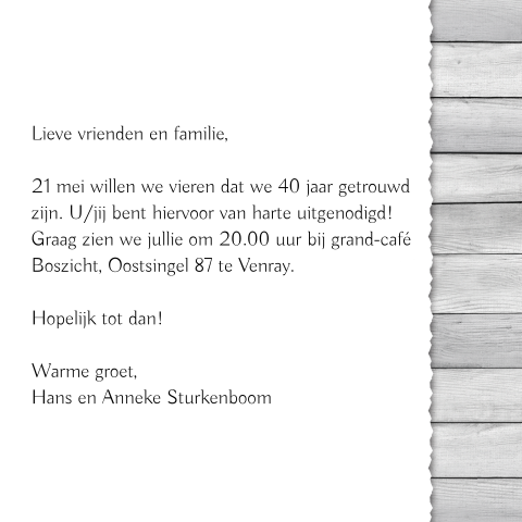 Stijlvolle trouwkaarten > jubileumkaarten > klassiek > romantische huwelijksjubileumuitnodiging voor 40 jaar getrouwd. Of jullie nou 40 jaar getrouwd, 25 jaar getrouwd, 50 jaar getrouwd, 60 jaar getrouwd, 5 jaar getrouwd of 10 jaar. Deze huisgemaakte kaart is geprint op stevig 350 grams wit papier, en wordt geleverd met envelop.