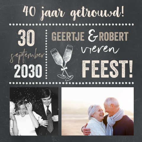 Mocht je nog geen idee hebben, of twijfelen over wat voor feest dan lees je op deze pagina enkele leuke en praktische tips voor het organiseren van een geslaagd huwelijksfeest! Hip kaartje uitnodiging 40 jarig huwelijk. Wij weten datgene het aantreffen en de krijgen met de 40 jarig huwelijksfeest met het beste stevigheid een beetje tijd kost, dus wij hebben gelijk breed scala aan.