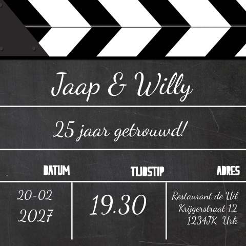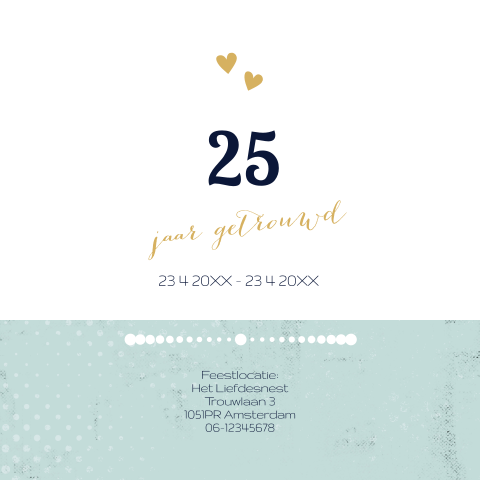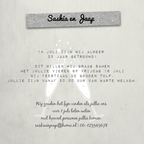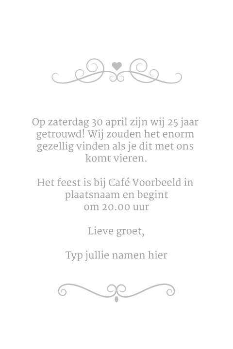 Een leuke kaart om het 25 jaar getrouwd feest aan te kondigen is zo gemaakt. Verstuur de mooiste uitnodigingen voor je 25 jarig huwelijksjubileum bij kaartje2go, de nummer 1 voor wenskaarten in testen van kassa!
