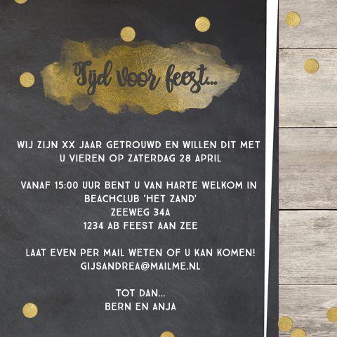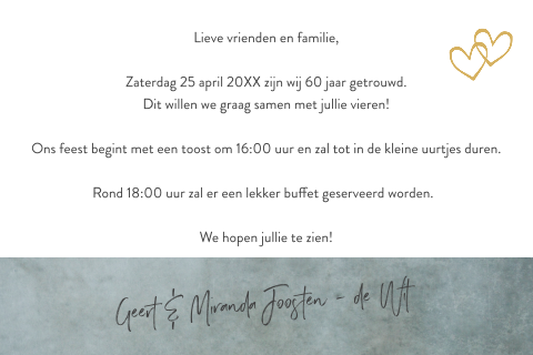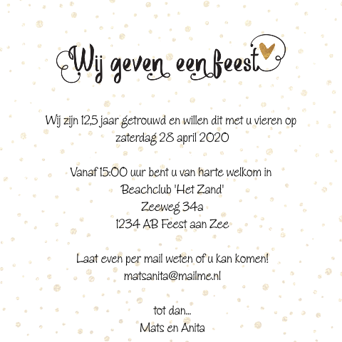 Uitnodiging 25 jaar getrouwd met gekleurde cirkels. Tevreden klanten we willen graag dat onze klanten blij worden. Jubileum uitnodigingen 25 jaar getrouwd met bloemen, champagneglazen en goudfolie! Hoe dan ook, 25 jaar getrouwd zijn is een hele stap en is iets wat veel mensen tegenwoordig helaas niet meer lukt. Uiteraard willen wij dit niet ongemerkt voorbij laten gaan en daarom geven wij een groot feest! Moderne 50 jarig huwelijk kaart van licht grijs met een chalkboard label. Laat je inspireren door een tekst die je vindt bij 'teksten voor jubileum'. Liefde is eindeloos, puur en oprecht. Liefde maakt blind, maar als je getrouwd bent gaan je ogen wel open. Op zoek naar leuke teksten die horen bij een 25 jarig huwelijk? Kaart een traditionele 25 jaar getrouwd uitnodiging kaart kun je kopen in elk winkelcentrum. Vind de perfecte tekst voor op je uitnodiging! Wij verzamelen in deze categorie leukste producten zoals:feestartikelen ballonnen 25 jaar 6 st, decoratie hangslingers zilver 25 jaar, 25 jaar jubileum decoratie lint zilver, cocktailprikkertjes van 25 jaar 100. Speciaal voor jou hebben wij een. In de derde persoon deze keer, dus voor het geval je een uitnodiging voor je vader en moeder maakt bijvoorbeeeld. 60 jaar oud uitnodigingen verjaardag cijfer 60+, 2 foto's. Op 20 september is het alweer 25 jaar geleden dat wij zijn getrouwd! Bij dit mooie huwelijksjubileum (ook wel een zilveren bruiloft genoemd) horen hele mooie uitnodigingen. Dat is gelijk een mooie gelegenheid om even bij te praten. Uitnodiging 25 jaar getrouwd feest. Op deze trouwkaart staat op een witte achtergrond in gekleurde letters teksten over 10 jaar getrouwd zijn. Kies jouw uitnodiging 25 jaar getrouwd en pas het daar hoort een mooi feest bij met een spetterende uitnodiging voor 25 jaar huwelijk. Uitnodiging 25 jaar getrouwd met gekleurde cirkels. Een goede reden om dat uitgebreid en uitbundig te vieren! Op zoek naar leuke jubileum tekst voor op je huwelijks jubileum uitnodiging. 25 jaar getrouwd uitnodigingskaarten de meesten vinden de traditionele uitnodigingskaart voor het huwelijksjubileum toch het leukst. Nog een leuke tekst voor een huwelijksjubileum uitnodiging. Stuur het echtpaar daarom een kaartje met een leuke 25 jaar getrouwd tekst! Dan zit je hier goed. Kies voor een 25 jarig huwelijksfeest dat past bij wie jullie zijn. 25 jaar getrouwd jubileumkaarten & uitnodigingen maken gratis proefdruk als best beoordeeld voor 20:00 besteld.bekijk hier onze leuke tips om jullie jubileum te vieren.