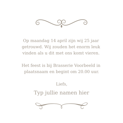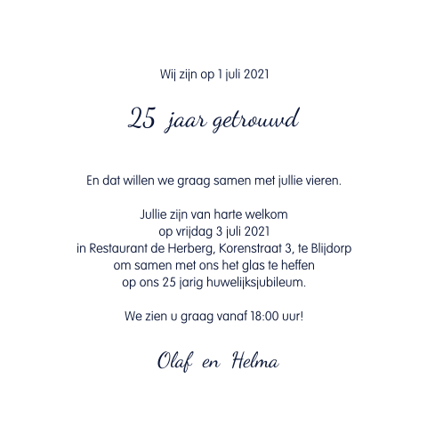 Op een 25 jaar getrouwd feestje is het belangrijk dat de flow goed in de dag of avond zit. Natuurlijk met een persoonlijk uitnodigingskaartje!
