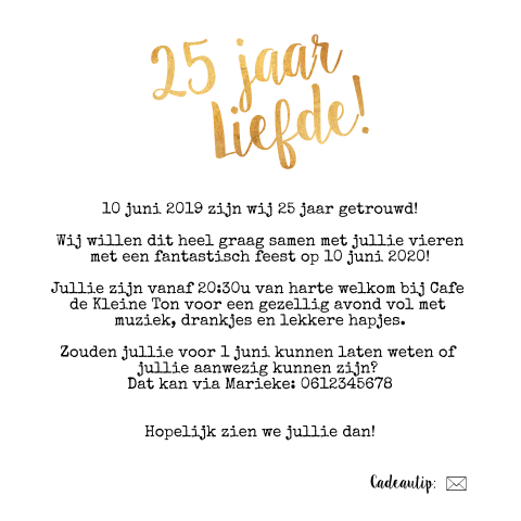 Op een 25 jaar getrouwd feestje is het belangrijk dat de flow goed in de dag of avond zit. Natuurlijk met een persoonlijk uitnodigingskaartje!
