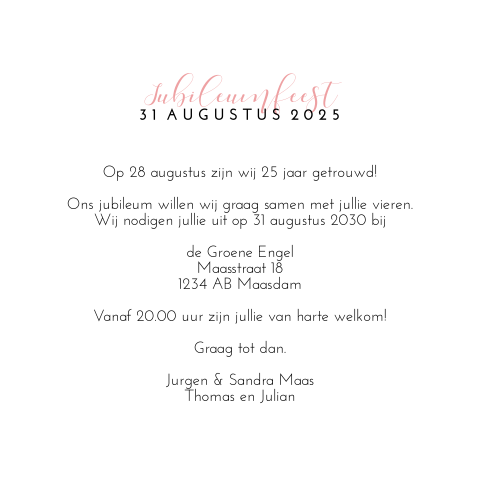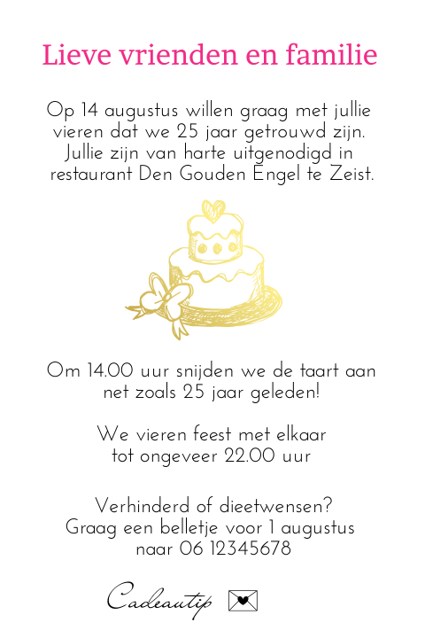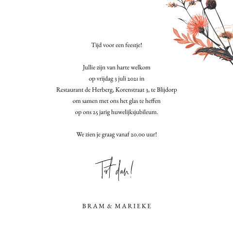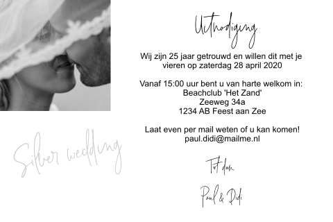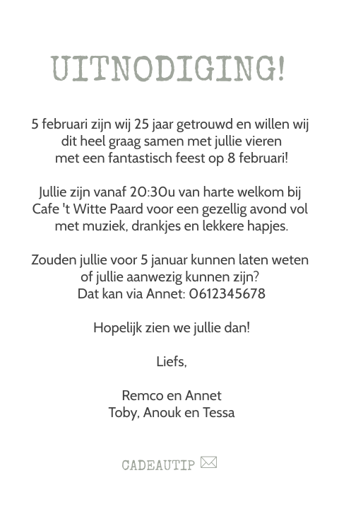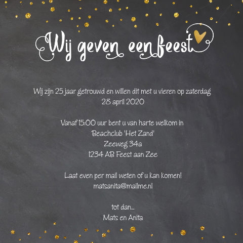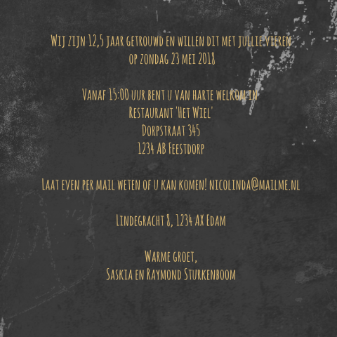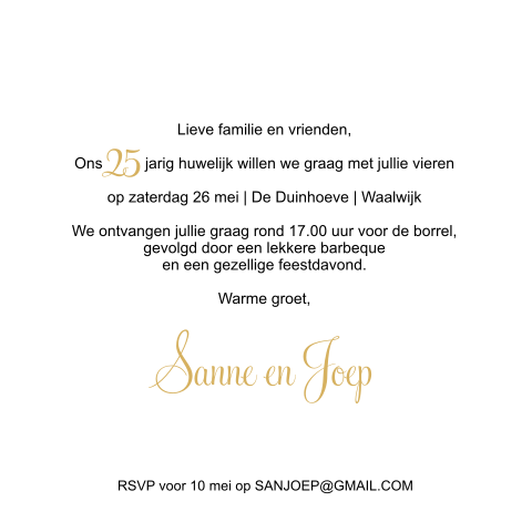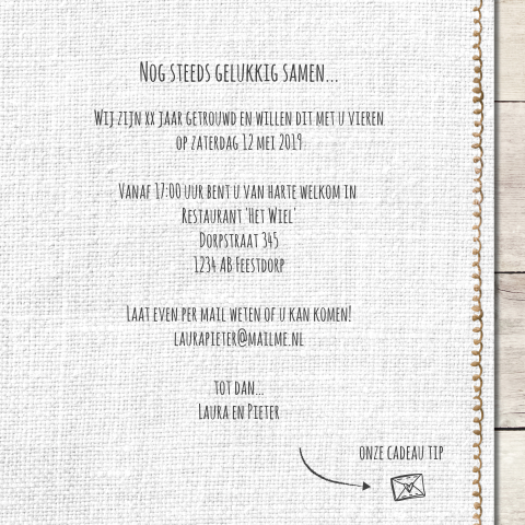 Bovendien kun je bij ons de leukste teksten voor op je uitnodigingen vinden. Deze uitnodiging voor een 25 jarig huwelijk heeft een achtergrond textuur van hout. U wordt om 20.00 op deze locatie verwacht voor ontvangst met koffie en gebak!