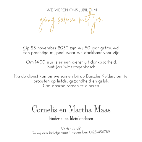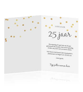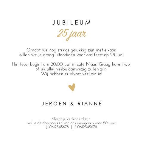 In zwart wit met goud (let op geen echt goudinkt). In zwart wit met goud (let op geen echt goudinkt). Zo creëer je jouw eigen persoonlijke. Deze kaarten vind je misschien ook leuk. Tekst die ik kan gebruiken voor ons 25 jarig huwelijk. Liefde is een huwelijk van aantal jaar. Deze uitnodiging voor een 25 jarig huwelijk heeft een achtergrond textuur van hout. Waarna ik eigenlijk opzoek ben is het volgende. Mooi zwart krijtbord look canvas met daarop twee leuke foto's van jullie bijzondere leven samen en de tekst 40 jaar. Op datum is het al weer 25 jaar geleden dat wij in het huwelijksbootje stapten dit willen we natuurlijk niet ongemerkt voorbij laten gaan en dus gaan we dit. Aan de binnenkant kun je een foto plaatsen van nu en aan de rechterkant is ook de uitnodiging tekst zelf aan te passen. Mooie witte uitnodigingen met zilveren bollen. Bovendien kun je bij ons de leukste teksten voor op je uitnodigingen vinden. Bekijk hier de 25 jarig huwelijk teksten voor op een kaartje. De foto is aan te passen met jullie trouwfoto. Een 25 jarig huwelijksjubileum is iets speciaals. De leukste en meest originele huwelijksuitnodiging teksten. Het belangrijkste is dat je niet vergeet je gasten uit te nodigen en te vertellen hoe laat en. Verjaardagstekst en uitnodiging 65 jaar. Uitnodiging voor huwelijksjubileum met bloemen. Moderne, hippe uitnodiging voor een zilveren 25 jarig huwelijk. Liefde is troost vinden, dicht bij elkaar. 25 jaar getrouwd uitnodiging maken. Maar welke tekst plaats je nu op de uitnodigingen voor jullie huwelijkdag? 25 jaar getrouwd, dat is een feestje waard! Mooie uitnodigingskaart voor jullie 25 jarige huwelijksfeest! Vier het 25 jarig huwelijk met een geweldig jubileumfeest en maak vandaag nog de 25 jaar getrouwd uitnodiging. Laat kinderen of familie de tekst goed. Home > jubileumkaarten > 25 jaar getrouwd > uitnodiging 25 jaar huwelijk met houtlook. Wij hebben een speciale tekst voor je om op je kaart te schrijven. De uitnodiging voor jullie 25 jarig huwelijksfeest maak je ongeveer 8 weken van te voren.