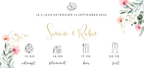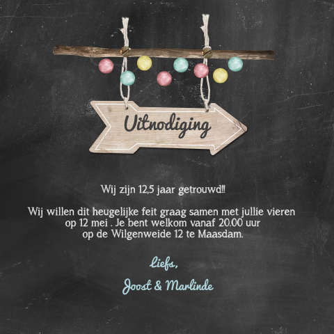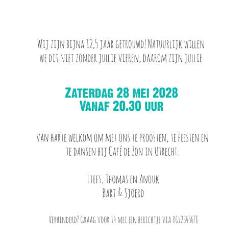 Kies een kaart uit de collectie jubileumkaarten of begin met een blanco. Uitnodiging 12.5 jaar getrouwd in rap vorm.