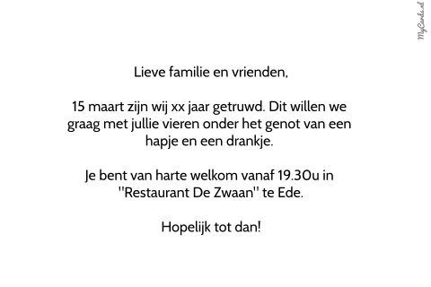 Uiteraard willen wij dit niet. Omdat we nog steeds heel gelukkig zijn met elkaar willen we dit graag met jullie vieren. Multi, uitnodigingen, 35 jaar getrouwd, dubbel, vierkant, zonder foto, bloemen, anet illustraties, groen, paars. Er zijn namelijk een aantal bekijk hier de 50 jaar getrouwd uitnodigingskaarten van greetz. En vandaag zijn we 35 jaar getrouwd. De achtergrond van de kaart is een kartonlook met lijntjespatroon. Uitnodiging 12.5 jaar getrouwd in rap vorm. Uiteraard willen wij dit niet. Jubileum & speciale leeftijden » 35 jaar. 25 jaar getrouwd zijn is zeker een feestje waard en om dit dan ook goed te vieren is een leuk feest uitnodigingskaarten 25 jaar getrouwd. Deze kaart is voor hele lieve vrienden van ons die 35 jaar getrouwd zijn deze maand. Gefeliciteerd met jullie zilveren bruiloft! 25 jaar getrouwd zijn is een bijzonder en dat verdient een feestje. Het belangrijkste onderdeel van je persoonlijke uitnodiging is de foto. Home > uitnodigingen > uitnodigingen overige jaren getrouwd maken uit beste keuze uitnodigingen > uitnodiging 35 jaar getrouwd foto. Grote collectie jubileumkaarten of ontwerp samen met ons. Dit wilt u natuurlijk delen met familie, kennissen en vrienden. En natuurlijk is een gescande trouwfoto van 25 jaar geleden het leukst. 50 jaar getrouwd, een gouden huwelijksfeest. Wij zien jullie graag op 17 december, groetjes gerard en jacqueline. Jullie jubileum feest is bijzonder en daar hoort natuurlijk ook en bijzondere. Bij jullie gouden bruiloft hoort natuurlijk een geweldig feest met familie en vrienden. Mooie uitnodigingen 50 jaar getrouwd, vier jullie gouden huwelijk! De uitnodiging 50 jaar getrouwd maak je heel eenvoudig online in onze kaartmaker. Op 20 september is het alweer 25 jaar geleden dat wij zijn getrouwd! Vandaag zijn de vader en moeder van onze schoondochter 35 jaar getrouwd en daar hoort natuurlijk een kaartje bij. Ik 20, hij 23, een jong stel maar we waren eraan toe na 3,5 jaar verkering. Drink je met mij mee, op zaterdag 2 juni vanaf 20.00 bij mij thuis: Ben je binnenkort 35 jaar getrouwd en wil je dit vieren met vrienden, collega's en familieleden? Uitnodiging 25 jaar getrouwd feest. Iedereen heeft hem nu ontvangen dus kan het.