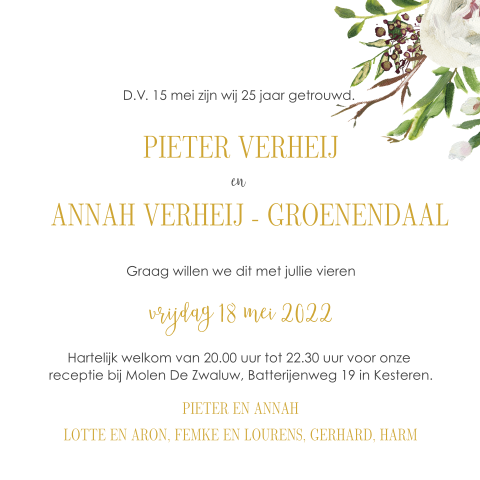 Huwelijksjubileum uitnodiging zelf maken bij lovz. Wij willen graag iets terug doen voor onze ouders jan en janny jansen. Deze kaart heeft een langere verzendtijd: Bijzonder om dat samen met familie en vrienden te vieren. De goudlook verfspetters maken deze jubileumkaart geen, home, hartje, jubileum, uitnodiging, 50, aanpasbaar, chic, stijlvol, vierkant, vierkant, dubbel, geertje burgers, bloemen, goud, wit. Met daarop in het label de tekst gouden huwelijk 50 in het goud, maken dit de juiste kaart voor jullie gouden jubileum. Mooie dubbele uitnodiging voor jullie 50 jarig huwelijksjubileum. Voor 18.00 uur besteld = de volgende werkdag gedrukt en verzonden. Uitnodigingsteksten voor een 50 jarig huwelijk: 50 jaar getrouwd, een gouden huwelijksfeest. Made for moments > jubileumkaarten huwelijksjubileum > 50 jaar getrouwd > 50 jarig jubileum uitnodiging. Dit is het 9e tevens laatste deel van de video van het 50 jarig huwelijksjubileum van rudolph & grace paulus in de eemhof, augustus 1999. Dit bericht werd geplaatst in huwelijksjubileum en getagged met 1 jaar huwelijksjubileum, 10 jaar getrouwd, 12 1/2 jaar getrouwd, 40 jaar getrouwd, 50 jaar getrouwd. Tips voor een 50 jarig huwelijksfeest 50 jaar getrouwd zijn is de reden om een feestje te geven. Grote collectie jubileumkaarten of ontwerp samen met ons. Samen met hen vier je het huwelijksjubileum en sta je stil bij de 50 jaren die jullie als stel, vrienden en kennissen. De uitnodiging voor een huwelijksjubileum maak je eenvoudig en het 12,5 jarig huwelijk heet het bronzen huwelijk en als je 25 jaar getrouwd bent is er sprake van een zilveren huwelijk. Wij zouden je graag uitnodigen om ons 50 e jubileum te vieren op 18 augustus jan en jannie jansen wanneer? Home > uitnodiging maken > 50 jaar getrouwd > uitnodiging 50 jarig huwelijksjubileum wijnproeverij. Chique uitnodiging 50 jarig huwelijksfeest met een groot hart in goudlook met daarin rozen bladeren. Home > uitnodiging maken > 50 jaar getrouwd > uitnodiging biertjes 50 jarig huwelijk. Het wordt ook wel het 'tinnen' huwelijksjubileum genoemd. Met sierlijke lettertypes en aan de binnenkant vrolijke icoontjes. Uitnodiging 50 jarig jubileum met goud op krijtbord. Chique uitnodiging voor 50 jarig jubileum met lieve hartjes en tekst in goudfolie op grijs blauw. Gefeliciteerd met jullie gouden huwelijk! De foto geeft de kaart een extra persoonlijke tint! Folie ballon cijfers 50 jaar getrouwd uitnodiging krijtbord met goud. Wij hebben huwelijksjubileum uitnodigingen voor als je 12,5 jaar, 25, 40, 50 of 60 jaar getrouwd bent. Uitnodiging 50 jarig jubileum retro. Overige bestellingen en proefdrukken drukken en versturen wij de volgende werkdag brievenbuspost.