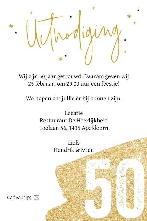 Dit vier je natuurlijk met een bijzonder en spectaculair cadeau. Tijd voor een feestje want op 10 oktober ben ik jarig. Home handig teksten uitnodiging huwelijk. Uitnodiging 40 jarig huwelijk bloemen en schoolbord. Of jullie nou 40 jaar getrouwd, 25 jaar getrouwd, 50 jaar. Vanaf 18.00 zijn jullie welkom in café drankje. Bij een 40 jarig huwelijk hoort een groots feest, en voor een groots feest heb je een toepasselijk uitnodigingskaartje nodig. 40 jaar getrouwd tekst uitnodiging. Bekijk hieronder een mooi overzicht met spreuken die gaan over het 40 jarige huwelijk, ook heb je de mogelijkheid om zelf een mooie spreuk toe te voegen aan deze pagina, de pagina te delen met anderen en eventueel een mooi. Een 40 jarig huwelijk is een reden tot feest. Maar welke tekst plaats je nu op de uitnodigingen voor jullie huwelijkdag? Mooie uitnodiging met losse teksten in modern lettertype, goud gekleurde hartjes en de ondergrond heeft een kraft look. Deze dag vieren we graag met onze dierbaren tijdens een romantische rondvaart, met hapje en drankje, door onze amsterdamse grachten. En bij een feest horen natuurlijk gasten. Het feest zal zijn op vanaf wil je online leuke originele huwelijks jubileumkaarten maken een gouden huwelijk is een heel speciaal moment en vraagt om een uitbundig feest. Een tekst nodig voor je 12,5 jarig huwelijksjubileum? Robijnen huwelijk het 40 jarig huwelijk wordt ook het robijnen. Uitnodigingen voor een robijnen huwelijk. 8 stuks uitnodigingen met envelop voor je 40 jarig huwelijksfeest. 18 jaar samen 12,5 jaar getrouwd 2 prachtige kinderen en nog steeds in love! Kies een kaart die jullie. Maar over het algemeen zullen je gasten liever niet met lege handen aankomen. Stijlvolle uitnodiging voor een 40 jarig huwelijk. Voorbeeld teksten 40 jarig huwelijk: Kies uit de mooie collectie jubileumkaarten en bestel een proefdruk. Op je verjaardag wil je natuurlijk zoveel mogelijk familie en vrienden. De teksten van zowel de voor en binnenzijde van de kaart zijn gemakkelijk aan te passen. En wel voor de 40e keer! De leukste en meest originele huwelijksuitnodiging teksten. Eerdaags jullie 40 jarig huwelijks jubileum feest geven? Lang leve het bruidspaar dat 40 jaar 50 jaar 60 jaar 70 jaar of 80 jaar.