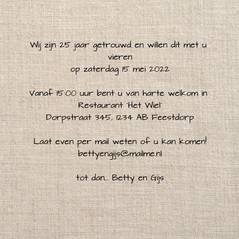 Dit willen we samen met jullie vieren op datum a.s. Een 25 jaar getrouwd uitnodiging versturen is eenvoudig met deze voorbeeld kaarten en voorbeeld teksten.