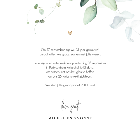 Jubileum uitnodigingen 25 jaar getrouwd met bloemen, champagneglazen en goudfolie! De kleine goudkleurige hartjes maken de kaart af. Een bijzondere kaart voor een bijzonder huwelijksjubileum. Ze zullen je ongetwijfeld heel dankbaar zijn. Verstuur je uitnodigingskaarten met leuke tekst. Maak een keuze voor een kaart en pas deze zelf naar wens aan met je eigen teksten. Stijlvolle uitnodiging voor een huwelijksjubileum met landelijke uitstraling. Stijlvolle uitnodiging voor een huwelijksjubileum met landelijke uitstraling. 25 jarig huwelijk uitnodiging wanneer je bijna 25 jaar getrouwd bent, of je kent iemand die binnenkort deze mijlpaal bereikt, dan is het zeker leuk om een groot feest te organiseren. Deze 25 jaar getrouwd kaart past perfect bij een. Wat gebeurde er op de dag 25 jaar geleden toen het jubileum paar in het …lees meer. Samen lief en leed gedeeld. Op dag datum zijn naam en naam 25 jaar getrouwd. Gefeliciteerd met jullie zilveren bruiloft! Een 25 jarig huwelijk is immers een geweldige prestatie en niet iedereen gegeven. Bovendien krijg je er een gratis proefdruk bij. De leukste 25 jaar getrouwd spreuken zijn veel terug te vinden op prachtige geschenken, wat dacht. Spreuken zijn meestal grappig en er zit altijd een een klein vleugje humor in. 25 jaar getrouwd uitnodigingskaarten de meesten vinden de traditionele uitnodigingskaart voor het huwelijksjubileum toch het leukst. Volg ons instagram pinterest facebook. En dat is een bijzondere reden voor een feestje. Uiteraard kun je ze helemaal. Als je originele teksten zoekt die als voorbeeld kunnen dienen, dan helpen we je hier graag bij. De kaart is in het echt zo mooi. Kies je design en maak je unieke kaart! Wij versturen de kaarten voor je op de gewenste datum !!! Ik kijk wel uit naar een feestje. Maak het bruidspaar gelukkig op deze voor hen zo bijzondere dag. Nog een leuke tekst voor een huwelijksjubileum uitnodiging. Gratis verzenden en echte proefdruk ❤ 25 jaar getrouwd? Bekijk hier alle 25 jaar getrouwd spreuken, grappige en ondersteunende 25 jaar getrouwd spreuken vindt u op deze pagina.