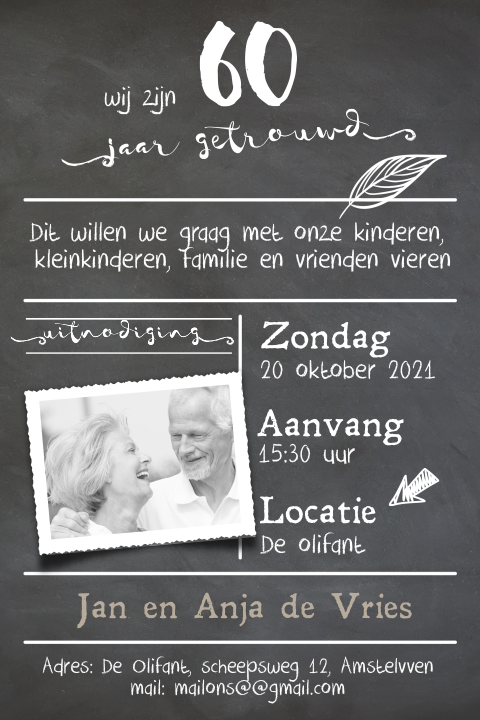 Vier jullie diamanten huwelijk met de mensen die jullie dierbaar zijn. Eindelijk weer eens een berichtje van mij, omdat ik eigenlijk helemaal door mijn voorraad heen ben, maak ik wat ik op dit moment nodig heb, ik hoop nu even klaar te zijn, onze vakantie gaat over een week beginnen en dan wordt er niet geknutseld. Vier jullie diamanten bruiloft met de mensen om wie jullie geven. 60 jaar getrouwd, uitnodigingen, dubbel, vierkant, zonder foto, krijtbord, modern, koper, anet illustraties, zwart. Hier mogen jullie best trots op zijn. Bij made for moments vind je mooie uitnodigingen met ruimte voor een persoonlijke foto. Binnenkant is in dezelfde kleur, maak hem zelf verder a. Tekst huwelijksjubileum 60 jaar getrouwd. Je vind 'm op uitnodigingen.nl. De jubileumkaarten met foliedruk in goud, zilver of koper krijgen een mooi glanzend laagje met goud, koper of zilver op plekken waar je dit hebt aangeven. 60 jaar getrouwd en nog steeds gelukkig? Kies je design en maak je unieke kaart! Je kan op diverse manieren uitnodiging huwelijksjubileum kaarten maken en. Uitnodigingskaart 60 jaar getrouwd jubileum krijtbord met koper tinten bladeren. Jubileumkaart 60 jaar huwelijk met foto. Een speciale stijl voor uitnodigingen voor een diamanten huwelijk is 'foliedruk'. Mijn meter en haar echtgenoot zijn dit jaar 60 jaar getrouwd. | proefdruk 1 60 jarig huwelijksjubileum. Kies je favoriete huwelijksjubileum uitnodigingskaart en ga creatief aan de slag! Lieve familie en vrienden, op dag datum jaartal zijn wij 60 jaar getrouwd en dit willen wij graag vieren. Vier jullie diamanten huwelijk met de mensen die jullie dierbaar zijn. De redactie • mei 03, 2021. Op fastcards vind je de leukste huwelijksjubileum uitnodigingskaarten. Het 60 jarige huwelijk is een echte mijlpaal. Dat kan met de leuke en aparte uitnodigingskaarten van fastcards. Bekijk de mooiste uitnodigingskaarten bij kaartcollectie.nl en zoek de mooiste kaart en bestel direct online. Spreuk 60 jaar getrouwd delen met anderen? Hallo allemaal, over een paar weken zijn de ouders van mijn schoonzus 60 jaar getrouwd. Kaartkeuze heeft een unieke collectie uitnodigingskaarten voor dit bijzondere moment. Mooie sepia kaart met ringen en roos voor een uitnodiging van een diamanten huwelijksjubileum. Jubileum uitnodigingen 60 jaar getrouwd met goud.