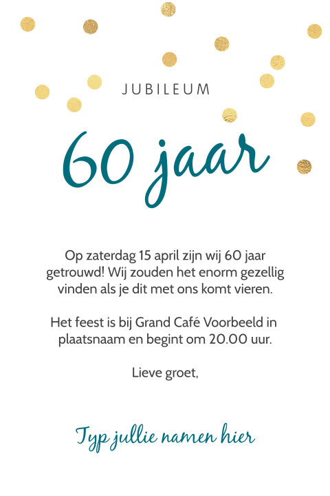 Lief, romantisch, klassiek of juist strak en modern? Kaart een traditionele 60 jaar getrouwd uitnodiging kaart kun je kopen in elk winkelcentrum. 50 jaar getrouwd, hartelijk gefeliciteerd €3,00 excl.