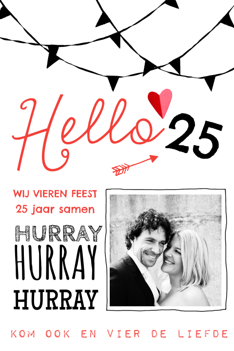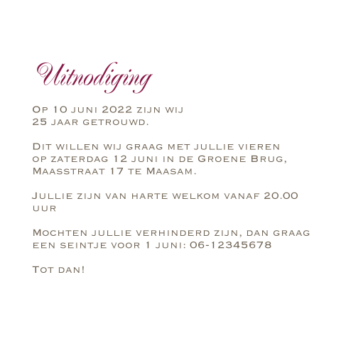 Kies een van onze leuke, hippe en chique uitnodiging ontwerpen en pas de teksten, foto's en kleuren aan naar wens. Iedereen is helemaal vrij om de 25e trouwdag in vulling te geven zoals ze zelf willen. Nee, natuurlijk hoeft dat niet.