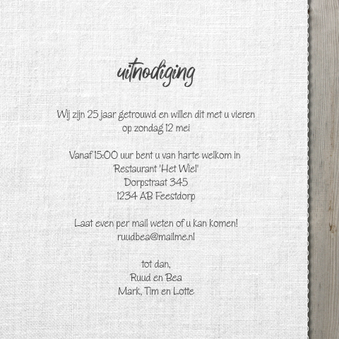 Een kwart eeuw huwelijk, oftewel een 25 jarig huwelijk is niet zomaar iets. De foto is aan te passen met jullie trouwfoto.