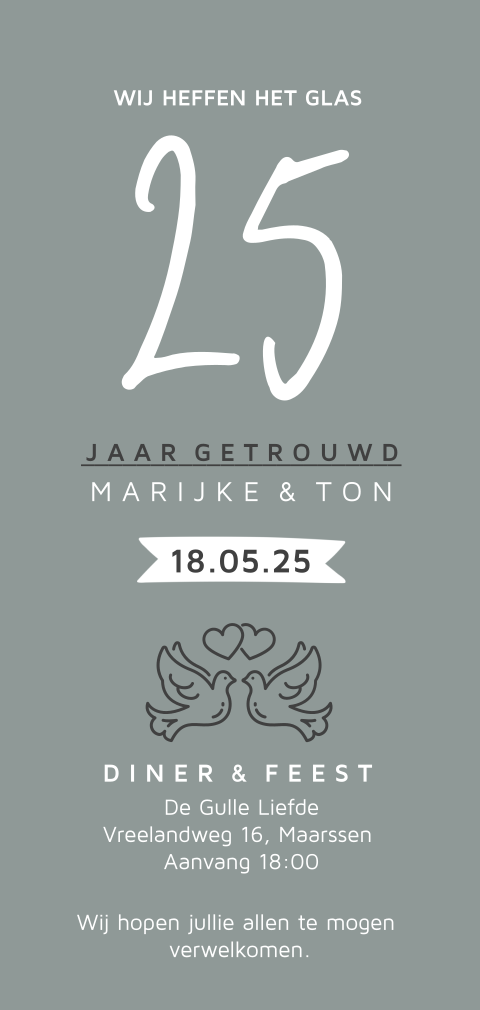Deze kaarten vind je misschien ook leuk. Deze kaarten vind je misschien ook leuk. Feestelijke uitnodiging voor een 25 jaar getrouwd feest.